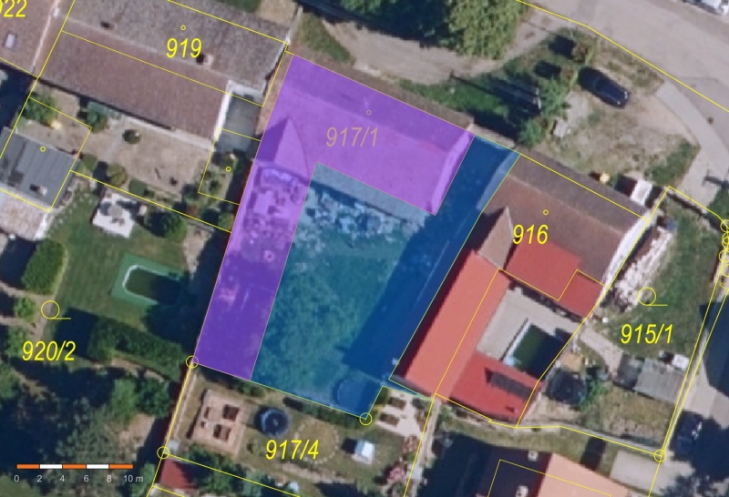 Předmětem dražby je rodinný dům č.p. 326/38 v k.ú. a obci Miroslav okres Znojmo. Dům je napojený na rozvod elektro, na obecní splaškovou kanalizaci, na obecní vodovod a na rozvod zemního plynu. Dům byl dokončen cca kolem roku 1890. Jedná se o zděný dům samostatně stojící, je částečně podsklepený, zastřešení je provedené sedlovou střechou bez podkroví. Obytné je 1.NP, kde je umístěná bytová jednotka 3+1. Obvodové zdivo v 1.PP je provedené jako smíšené cihelné a kamenné. Založení je provedené na kamenných základech bez izolace proti zemní vlhkosti. Strop nad 1.PP je provedený jako klenbový, podlaha je hliněná, vnitřní omítky zde nejsou provedené. Vstup do 1.PP je z prostoru dvora, dům se nachází na svažitém pozemku. Obvodové zdivo v 1.NP je pak provedené z plných cihel na tl. 45 cm. Strop nad 1.NP je pak dřevěný trámový se záklopem a omítkou. Zastřešení je dřevěným vaznicovým krovem sedlovým. Střešní krytina je pálená taška bobrovka. Klempířské konstrukce jsou z pozinkovaného plechu, hromosvod není proveden. Okna jsou dřevěná špaletová. Vnější i vnitřní omítky jsou vápenné. Vnitřní omítky jsou doplněné keramickým obkladem v koupelně, v kuchyni a na WC chybí. Elektroinstalace je světelná a motorová, rozvod vody je v plastu a v oceli, vytápění je plynovými topidly WAF. Vnitřní dveře jsou hladké lakované. Podlahy jsou z PVC a kobercové, ve vstupní chodbě je cementová dlažba. V koupelně je pak dlažba keramická. Dům je ve zhoršeném technickém stavu, chybí zde pravidelná údržba, je zde nutná rozsáhlejší rekonstrukce. Dispozice domu je následující: vstup do domu je z uliční části a dispozice začíná vstupní chodbou (předsíní). Vpravo z chodby je vstup do pokoje, rovno z chodby je vstup do dvora po vnějším schodišti. Vlevo od schodiště je pak dřevěná pavlač. Vlevo z chodby je vstup do dvou pokojů a dále pak do kuchyně. Z kuchyně je vstup do koupelny a na WC. Z prostoru dvora je pak vstup do sklepa, kde je sklad nářadí a kol. Předmětem dražby je stavební pozemek p.č. 917/1 - zastavěná plocha a nádvoří o výměře 500 m2. Pozemek je pravidelného tvaru a je ve sklonitém terénu. Příjezd je po obecní asfaltové komunikaci, stavební pozemek je napojený na rozvod elektro, na obecní vodovod, na obecní splaškovou kanalizaci a na rozvod zemního plynu. Dům je přístupný po zpevněné obecní komunikaci na p.č. 1060/1. Před vlastním domem je pak ostatní plocha, zeleň na p.č. 1059/1. Oba přístupové pozemky jsou ve vlastnictví města Miroslav. Parkování je zde možné na přístupovém pozemku přímo před domem.